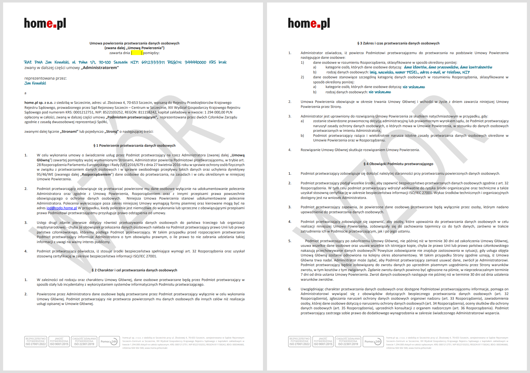 Poniżej możesz sprawdzić przykładową Umowę powierzenia przetwarzania danych osobowych. Dokładnie umowę o takiej treści otrzymasz po przesłaniu zgłoszenia do Biura Obsługi Klienta. Twoja umowa będzie uzupełniona podanymi przez Ciebie danymi ? na poniższych przykładach zaznaczyliśmy te treści na niebiesko.