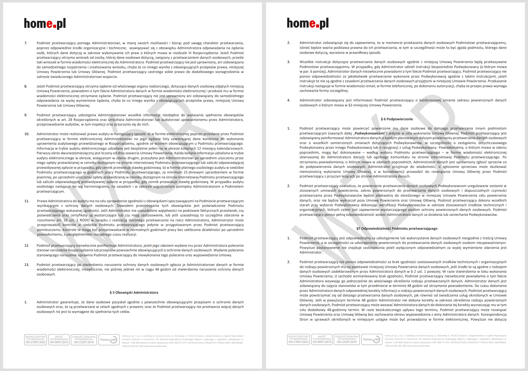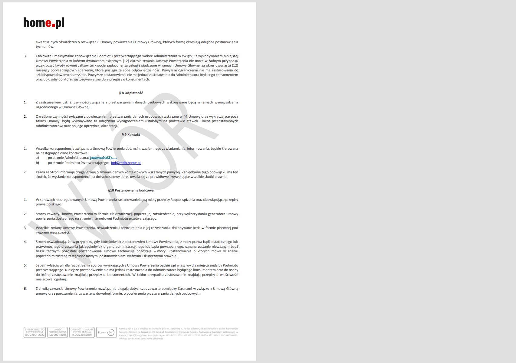 WAŻNE! Przygotowana w ten sposób umowa nie wymaga podpisania w formie pisemnej, ani odsyłania jej do home.pl, albowiem jest zawierana w trybie art. 384 Kodeksu cywilnego tj. akceptacji wzorca umownego.
